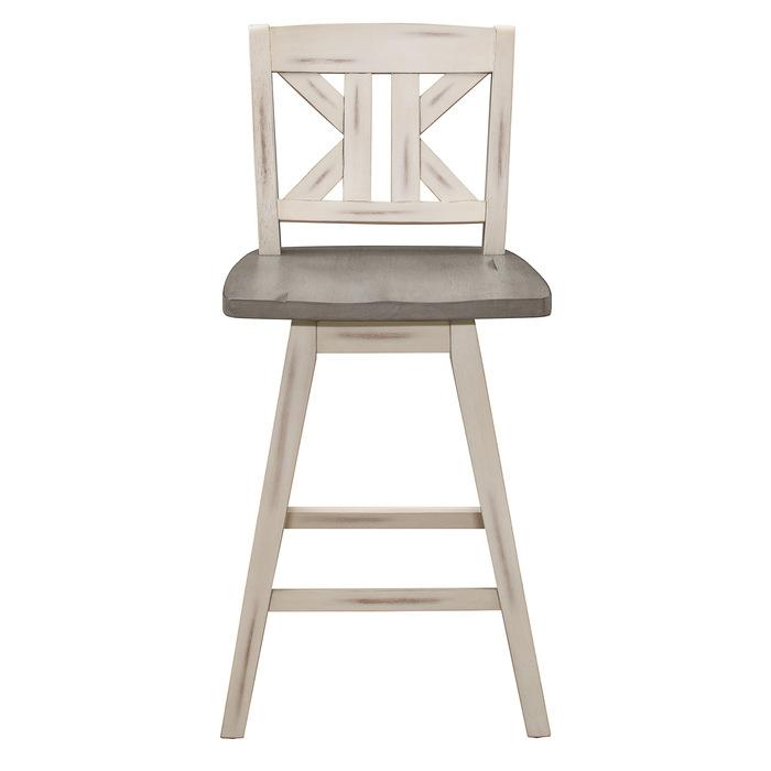 Creating a subtle rustic look for your dining space is the Amsonia Collection. A white sand-through finish graces the solid rubberwood 24-inch divided X-back swivel counter height chair, highlighting the veneer. 18 x 18 x 37.5H