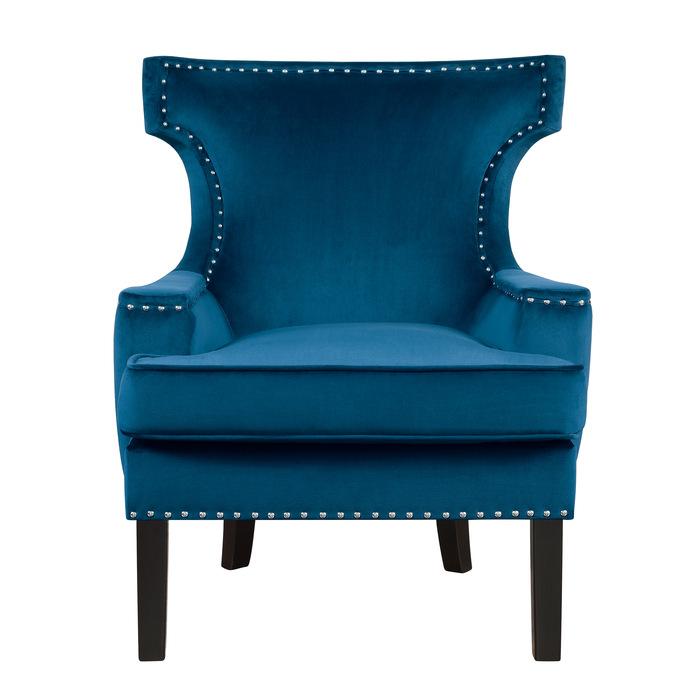 Elegant from the curve of the back to the defining decorative element, the Lapis Collection was created with your fashionable decorative sensibilities in mind. The blue velvet of this elegantly styled accent chair is sure to lend a touch of glamour to your space. The chair’s unique profile is defined with high-polish nail head accent and is perched atop black finished wood legs. The Lapis Collection is also offered in grey velvet.