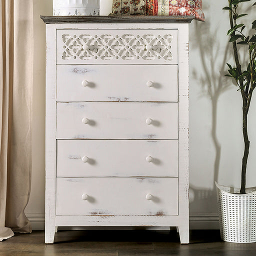 Casual style with substance. This two-tone chest of drawers raises the bar on comfortably cozy design in your soothing sanctuary. A sturdy silhouet...