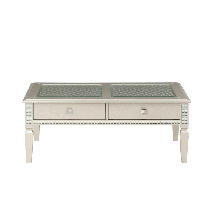 Radiating the iconic beauty of glamorous styling, the Juliette Collection is an elegant addition to your living room. The silver finish of the collection is reflected in the mirror trim that defines the profile of the cocktail table. The stylized legs that support the table lend subtle traditional accent while the decorative elements create a glamorous aesthetic. Storage drawers are conveniently located on the table’s apron with their embossed fronts featuring crystal-enhanced drawer knobs. Inset glass panels top the cocktail table, their presence serving to display the embossed and diamond patterned surface. 48 x 28 x 19.5H