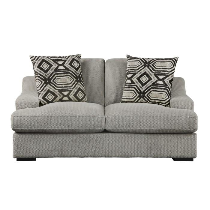 The modern low profile of the Orofino Collection is combined with the plush texture of fabric in a remarkable pairing of style and comfort. The gray textured plush microfiber offers a visually versatile pallet and a luxurious texture that enhances your seating experience. Contrast comes in the form of the geometric print toss pillows that accompany the love seat. Wood legs feature an espresso finish for discrete support. 68 x 38 x 36.5H