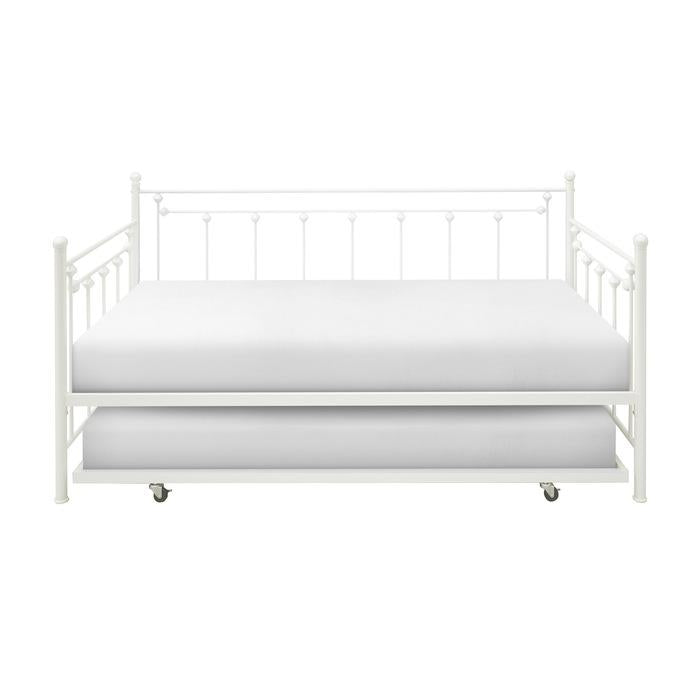 Classically styled for your traditional home, the Lorena Collection is offered in a white finish with accenting finials and turned metal connectors that complete the look of this daybed. The metal trundle provides additional sleep space to fit your needs. Daybed: 82.5 x 42 x 42H, Trundle: 76.75 x 41 x 4.25H