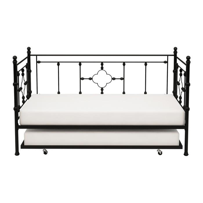 Modern traditional styling plays well with the décor of your home in the Auberon Collection. Quatrefoil pattern is, along with distinct jointing, as a decorative statement with the black metal framing serving as an update to the traditional look. A metal frame trundle glides from beneath the main sleeping platform to provide additional sleep space.