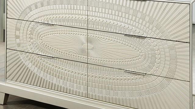 VALLETTA Dresser, 66 1/4"W X 18"D X 40"H, 226.6lbs. Gracing the panels of this dresser is an intricate play of radial and circular lines, engraved in polyresin material. Your eyes are drawn towards this beautiful pattern reminiscent of the art deco era. Mirror panels line each front edge, adding to the luxurious appeal. On top of that, the classy champagne finish exudes subtle warmth that makes this dresser, even in its grandeur, still plenty welcoming.