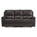 The Dawson Collection’s plush seating, pillow-top arms and versatile look make for the perfect addition to your home’s casual living space. Brown faux leather upholstery covers the sofa. The Dawson Collection’s manual motion mechanisms operate with the pull of a side-mounted tab, that once engaged, take you from seated to reclined in an easy motion. 78 x 39 x 39.5H