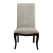 Sophisticated soft contemporary design is achieved in your dining room with the addition of the Savion Collection. Oval single pedestal table featuring a distinct birdcage style base. An espresso finish highlights the unique veneer pattern. Dramatic flair is lent to the design by the accompanying chairs. Neutral tone fabric covers the substantially sized roll back arm and side chairs. Reeded fronts on the server along with the serpentine profile further the elegance of this distinctly sophisticated collection.