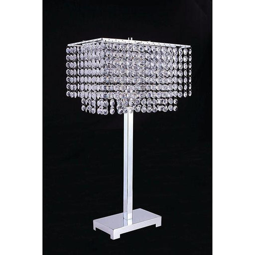 RENA Table Lamp, Hanging Crystal, 15"L X 9"W X 27"H, 7.55lbs. Diamond-cut faux crystals, which act as a unique shade, sit atop a metal base, giving...