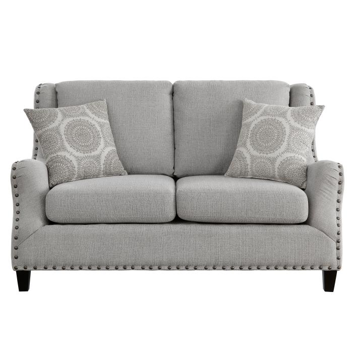 An air of elegance surrounds the Halton Collection, from its deeply curved arms to its classic accents, this seating group will provide the traditional feel you are looking to achieve in the design of your living room. The contoured recessed arms that anchor the love seat are defined by nail head trim and supported by espresso finished legs, each element providing subtle contrast to the gray textured fabric upholstery. Further accent comes in the form of the contrast toss pillows. 60.5 x 35.5 x 35H