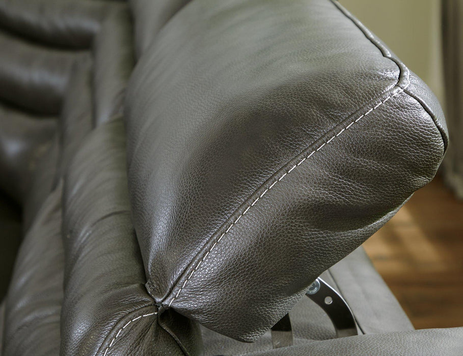 For those seeking to curate a living room retreat that offers superior comfort and a contemporary aesthetic, this sleekly designed power reclining sectional will become your favorite source of at-home serenity. Rest on leather match upholstery, and use the one-touch power control to recline and adjust the headrests with ease. As you recharge after a long day, your devices can too with USB charging. This sectional is visually enticing in a luxe dark gray, with slope track arms and stitched detailing on the back to enhance its modern appeal.