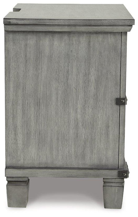 What's old is what's new with this nightstand. Serving up a fresh look in urban farmhouse style, this eclectic piece features a light weathered gray finish with dark aged bronze-tone bar pulls and metal straps for a casually cool sensibility. Profiled drawer frames, thick-profiled top moulding and tapered legs are the earmarks of timeless design.