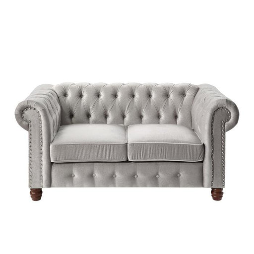 The iconic style of the Welwyn Collection exemplifies the timeless look of traditional design. This Chesterfield-style love seat is covered in gray...