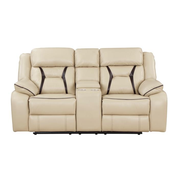 Ultra-modern design combined with convenient function makes the Amite Collection a stylish addition to your contemporary home. Beige premium faux leather upholstery is perfectly complemented by dark brown accenting on the seatbacks, seats, and arms of the love seat providing contrast and definition to the profile of the collection. With the push of the power reclining mechanism, the recliners ease to the prone position. The love seat features a console unit with hidden storage as well as cup holders for convenient functional use. Providing additional function is the side-mounted USB port on the recliners, providing quick access to your electronic device as it charges. 76 x 39 x 41H